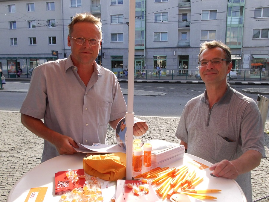 Bis zum Wahlsonntag am 14. September wird unser Stadtbezirksverband an jedem Freitag am Platz der Einheit vor Ort präsent sein und interessierte Wählerinnen und Wähler auf Veranstaltungen und Auftritte unseres Kandidaten Wieland Niekisch am darauffolgenden Sonnabend bzw. in der Folgewoche hinweisen. Auch wenn andere noch in den Ferien sind: Wir sind für Sie vor Ort