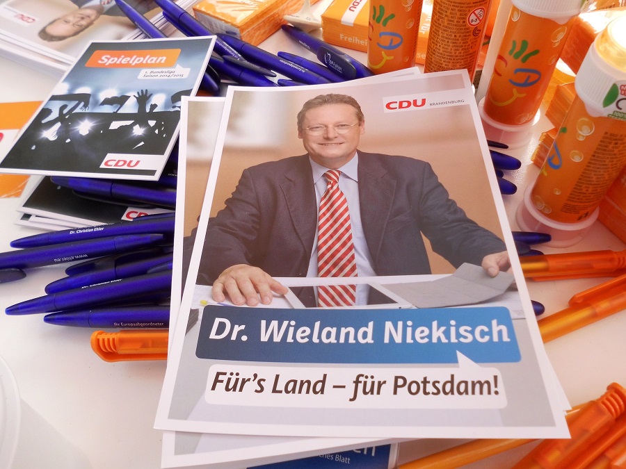 Samstagmorgen am Nauener Tor: Siebter Infostand der CDU Potsdam West für unseren Direktkandidaten im Wahlkreis 21, Dr. Wieland Niekisch und die CDU Brandenburg. Viele interessierte Wähler auf den Wochenmärkten, in Geschäften, Cafés und auf den Straßen in der Innenstadt.
