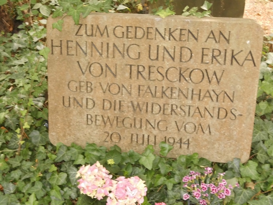 Nach dem Vortrag lud Pfarrer Wizisla die Anwesenden noch zu einem Rundgang über den Bornstedter Friedhof ein, auf dem er an Grabsteinen verschiedener Widerstandskämpfer und Angehöriger der Bekennenden Kirche gedachte und jeweils eine gelbe Rose niederlegte.