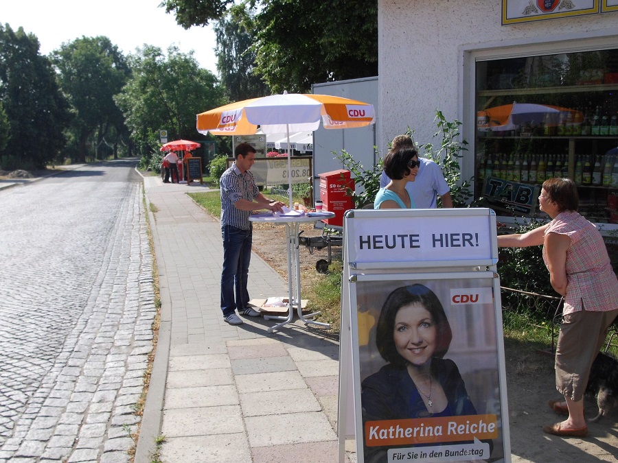 Samstagmorgen bei hochsommerlicher Hitze in Marquardt. Infostand des CDU-Stadtbezirksverbandes Potsdam West/Brandenburger Vorstadt zur Bundestagswahl. Mit dabei unsere Spitzenkandidatin, Katherina Reiche MdB, gleichzeitig Parlamentarische Staatssekretärin im Bundesministerium für Umwelt, Naturschutz und Reaktorsicherheit.