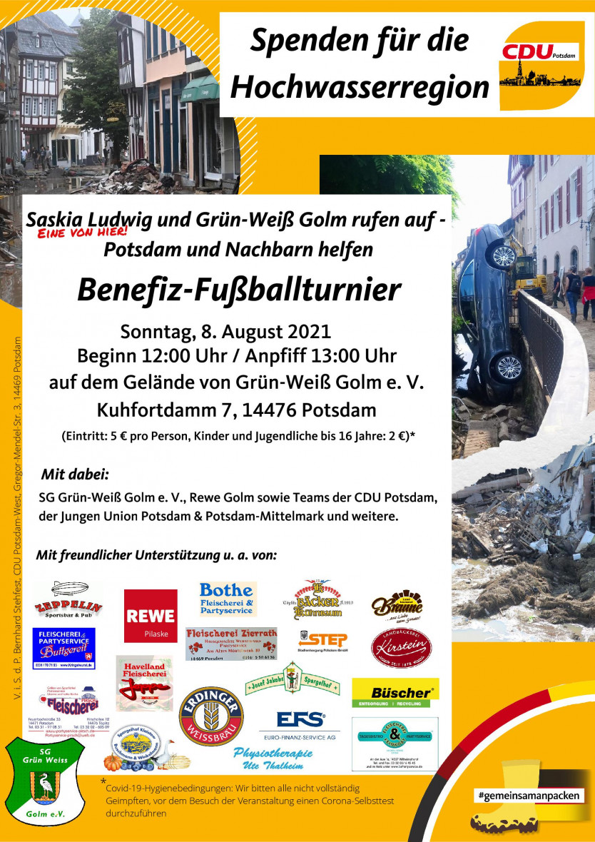 Sportlich setzte sich letztlich der Werderaner FC im Finale denkbar knapp im 9-Meter-Schießen gegen Grün-Weiß Golm durch (siehe Bildergalerie: Den letzten hat der Torwart gehalten). Im Mittelpunkt der Veranstaltung stand jedoch das gemeinsame Anliegen, spontan Hilfe zu leisten für die Betroffenen der Hochwassererkatastrophe im Westen Deutschlands.